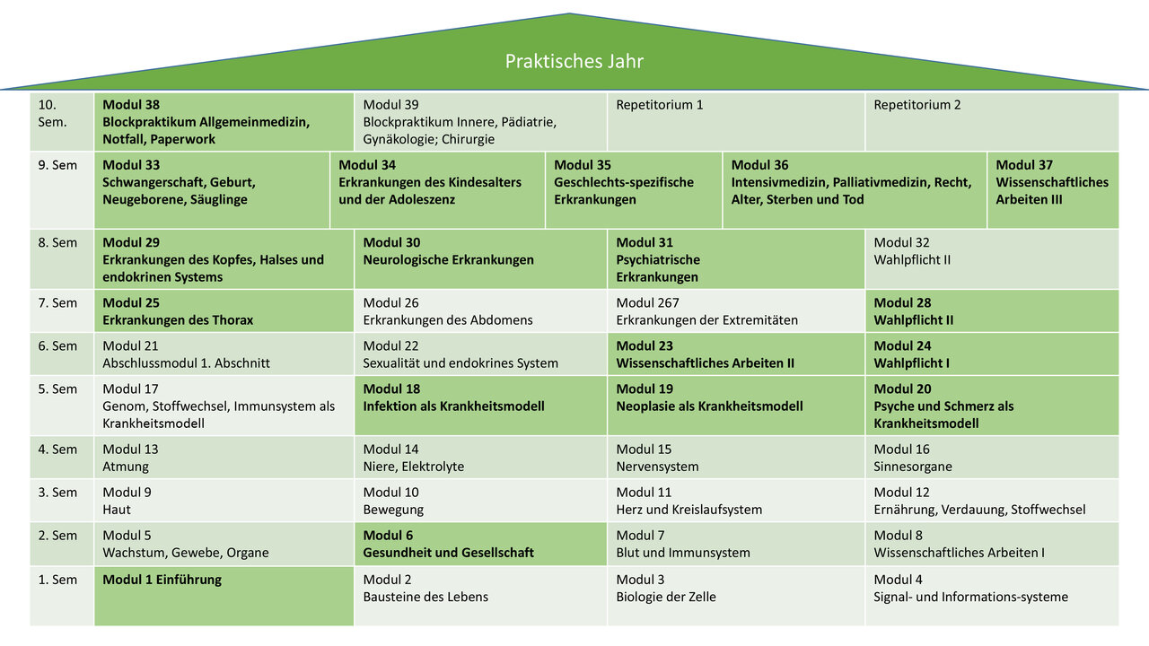 Derzeit werden an den 37 deutschen medizinischen Fakultäten 10 Modellstudiengänge angeboten [19]. An der Charité Universitätsmedizin Berlin wurde zum Wintersemester 2010 der Modellstudiengang (MSM) eingeführt und für über 600 Studierende pro Jahr umgesetzt. Der Modellstudiengang gliedert sich in 10 Semester und 40 drei- bis vierwöchige Module, die fächerübergreifend Themen vermitteln. Die Verzahnung von Vorklinik und Klinik war für die Entwicklung des Curriculums zielgebend. Modulübergreifend finden Problemorientiertes Lernen (POL) und ein Kommunikationstraining in Kleingruppen (Kommunikation, Interaktion, Teamwork: KIT) statt. In 19 von insgesamt 40 Modulen konnten allgemeinmedizinische Lerninhalte und Lehrveranstaltungen verankert werden.