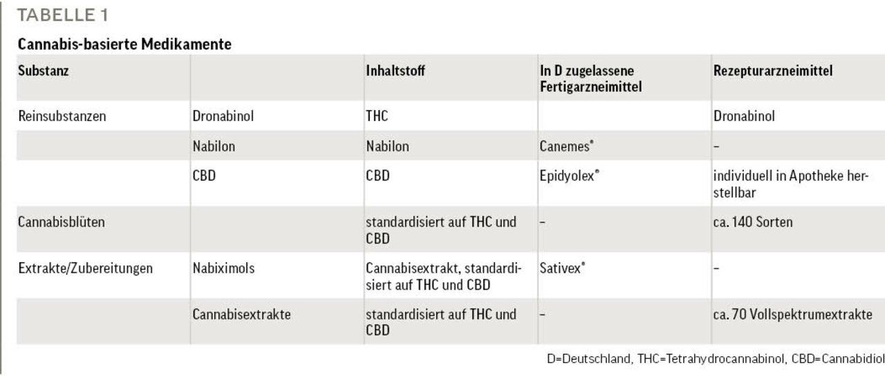 Die Einteilung der derzeit verfügbaren Cannabis-basierten Medikamente orientiert sich primär am Gehalt der beiden wichtigsten Cannabinoide Tetrahydrocannabinol (THC) und Cannabidiol (CBD). Darüber hinaus kann zwischen zugelassenen Fertigarzneimitteln und Rezepturen unterschieden werden. Schließlich spielt bei der Auswahl die Frage eine Rolle, ob die Behandlung oral oder inhalativ erfolgen soll.
