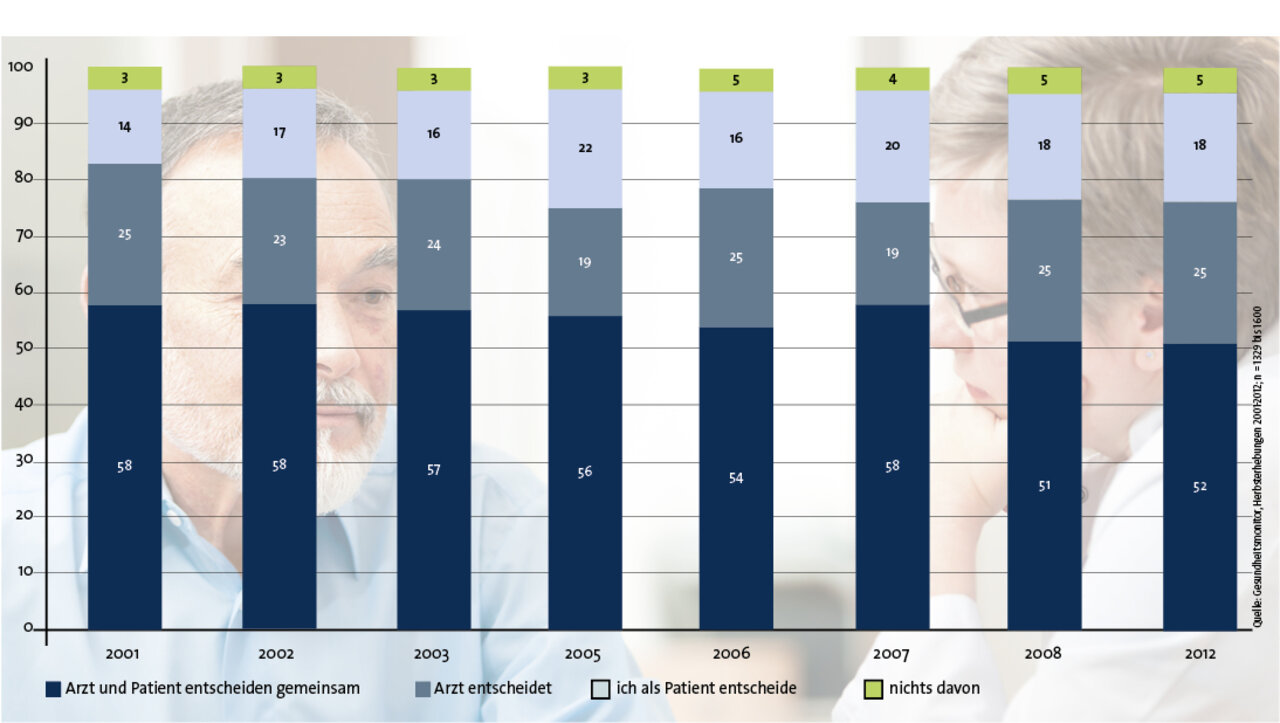 Im Zeitverlauf zeigt sich, dass mehr als die Hälfte der Befragungsteilnehmer seit dem Jahr 2001 relativ konstant eine gemeinsame Entscheidungsfindung von Arzt und Patient wünscht. Für das paternalistische Modell (Arzt entscheidet allein) stimmt knapp ein Viertel, das autonome Konzept wählt etwa ein Fünftel. Im Zeitraum der letzten elf Jahre haben sich keine nennenswerten Veränderungen ergeben, was die relative Häufigkeit dieser Präferenzen betrifft. Überraschend ist dabei vor allem, dass die Zahl der Befürworter eines paternalistischen Modells auf demselben Niveau geblieben ist. Jeder vierte Patient hält es also nach wie vor mit dem Motto: „Das soll der Arzt entscheiden, schließlich hat er Medizin studiert und nicht ich.“