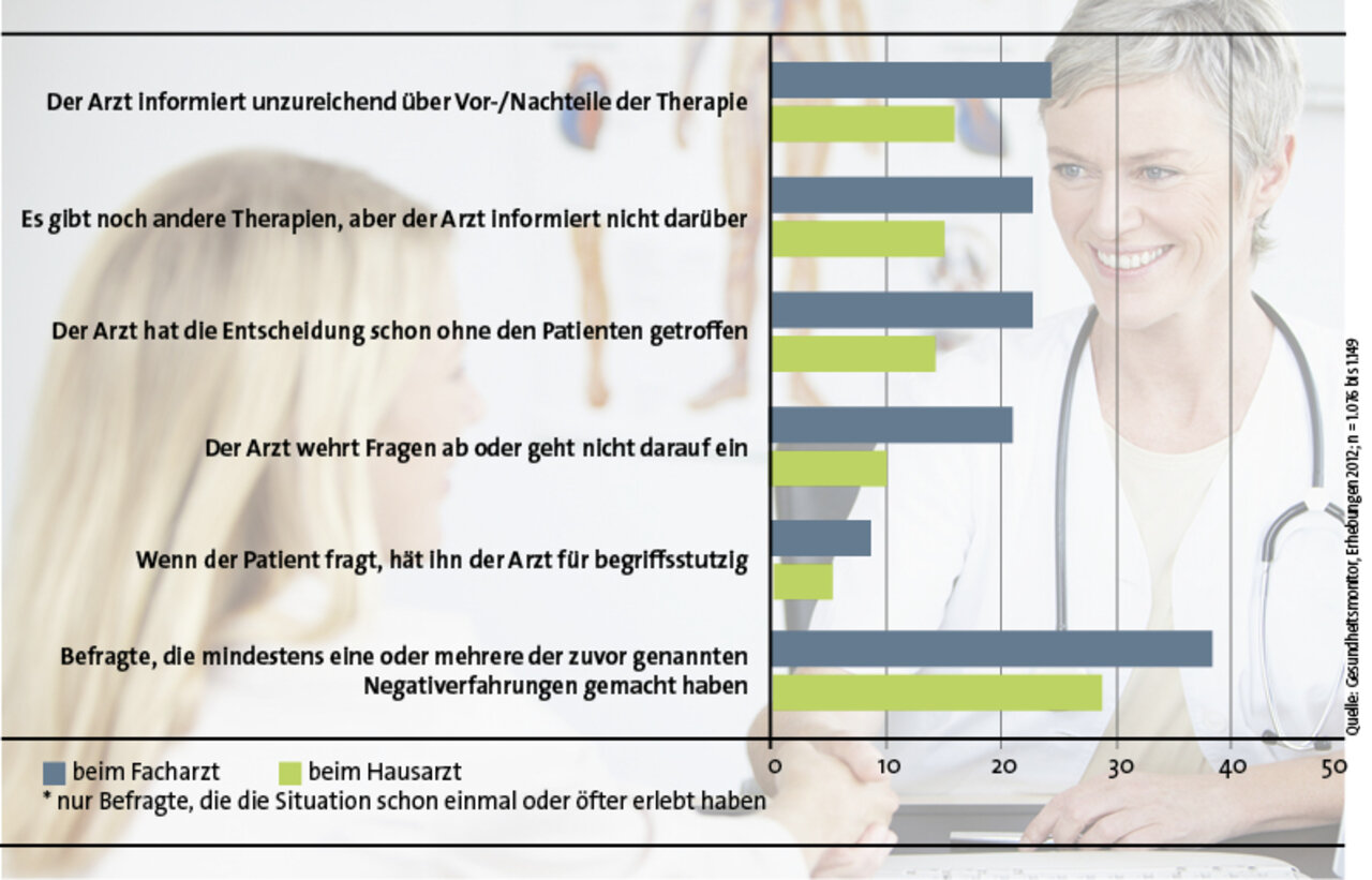 So zeigt denn auch die Frage, wie oft solche Entscheidungssituationen in der Praxis vorkommen, einen überraschenden Befund: Wenn man die Antworten der Kategorie „weiß nicht“ einmal unberücksichtigt lässt, sind fast zwei Drittel der übrigen Befragungsteilnehmer der Ansicht, eine solche Situation käme eher selten oder sehr selten vor. 58 % der Befragungsteilnehmer haben nach eigener Angabe in der Arztpraxis noch nie eine solche Situation persönlich erlebt. In den letzten drei Jahren haben 70 % beim Hausarzt und 64 % beim Spezialisten eine solche Situation gar nicht erlebt, weniger als jeder Fünfte einmal. Häufigere Erfahrungen haben nur sehr wenige gemacht: Dass es zweimal oder öfter zu Entscheidungssituationen gekommen sei, berichten beim Hausarzt 6 % und beim Spezialisten 8 %. Punkten können die Hausärzte beim Verlauf solcher Gespräche: Bei ihnen machten die Patienten weniger Negativerfahrungen wie etwa unzureichende Information über Vor- und Nachteile einer Therapie oder abwehrende Reaktionen auf Fragen des Patienten.